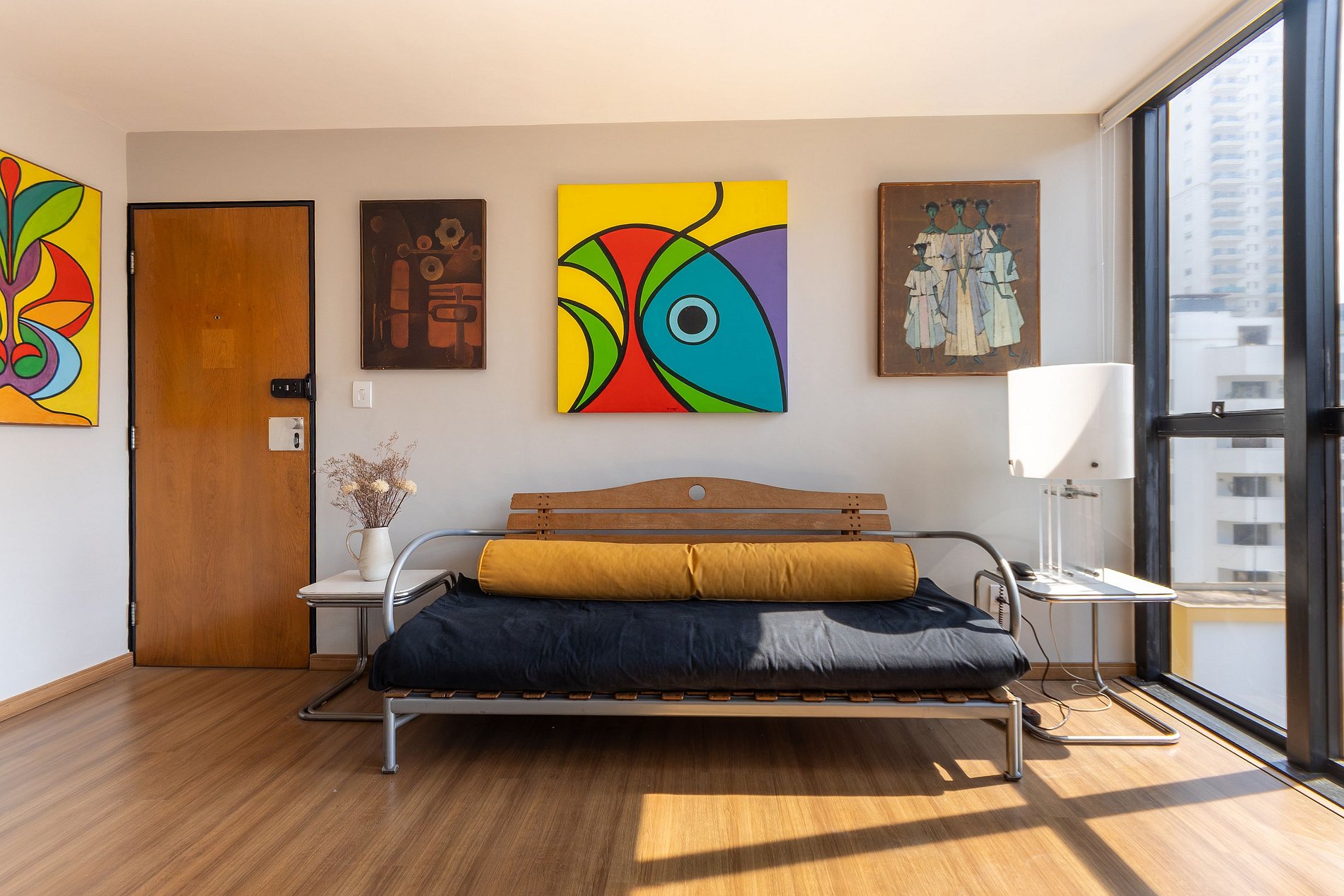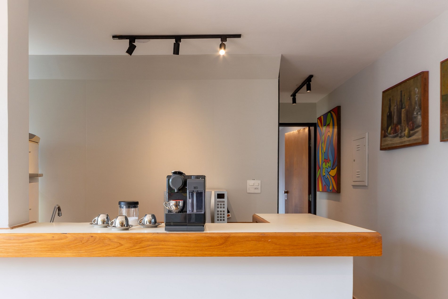 Com excelente iluminação natural e vista aberta da cidade, o espaço combina conforto, praticidade e um toque de personalidade na decoração, sendo ideal tanto para estadias a lazer quanto a trabalho. O apartamento é equipado com fechadura digital e decorado com quadros assinados por Gabriele Leozzi, pintor italiano.