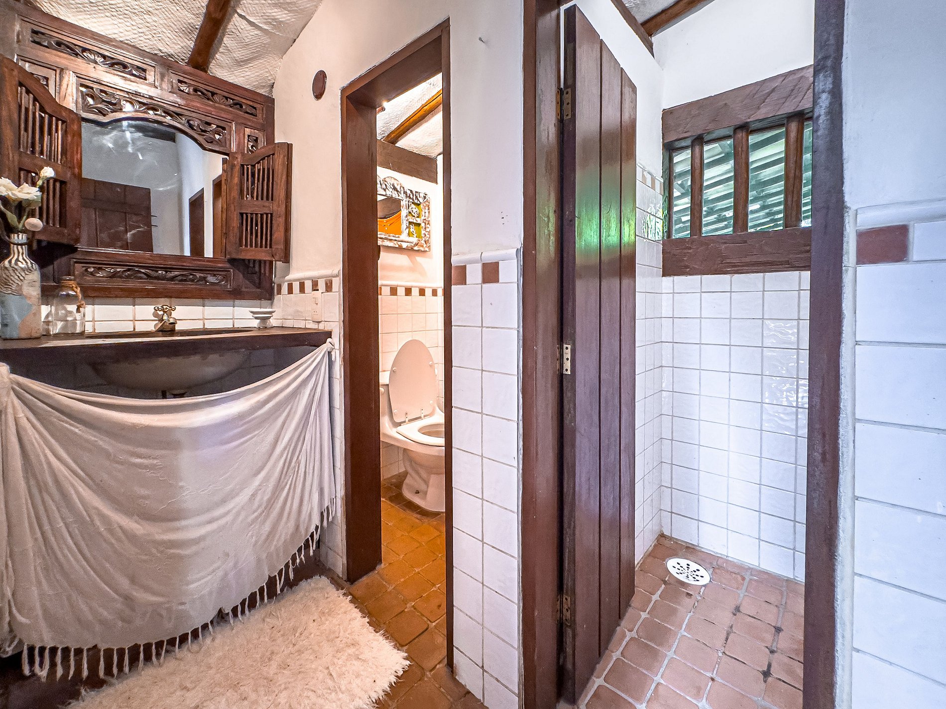 A casa conta com três quartos aconchegantes. O primeiro, com uma cama Queen, garante uma noite de descanso tranquila, enquanto o segundo quarto, equipado com duas beliches, é perfeito para grupos ou famílias com crianças. O terceiro quarto combina uma cama Queen e um beliche, acomodando ainda mais pessoas com conforto. Além disso, a casa possui três banheiros completos, um lavabo e um banheiro destinado aos funcionários, oferecendo total comodidade para todos.