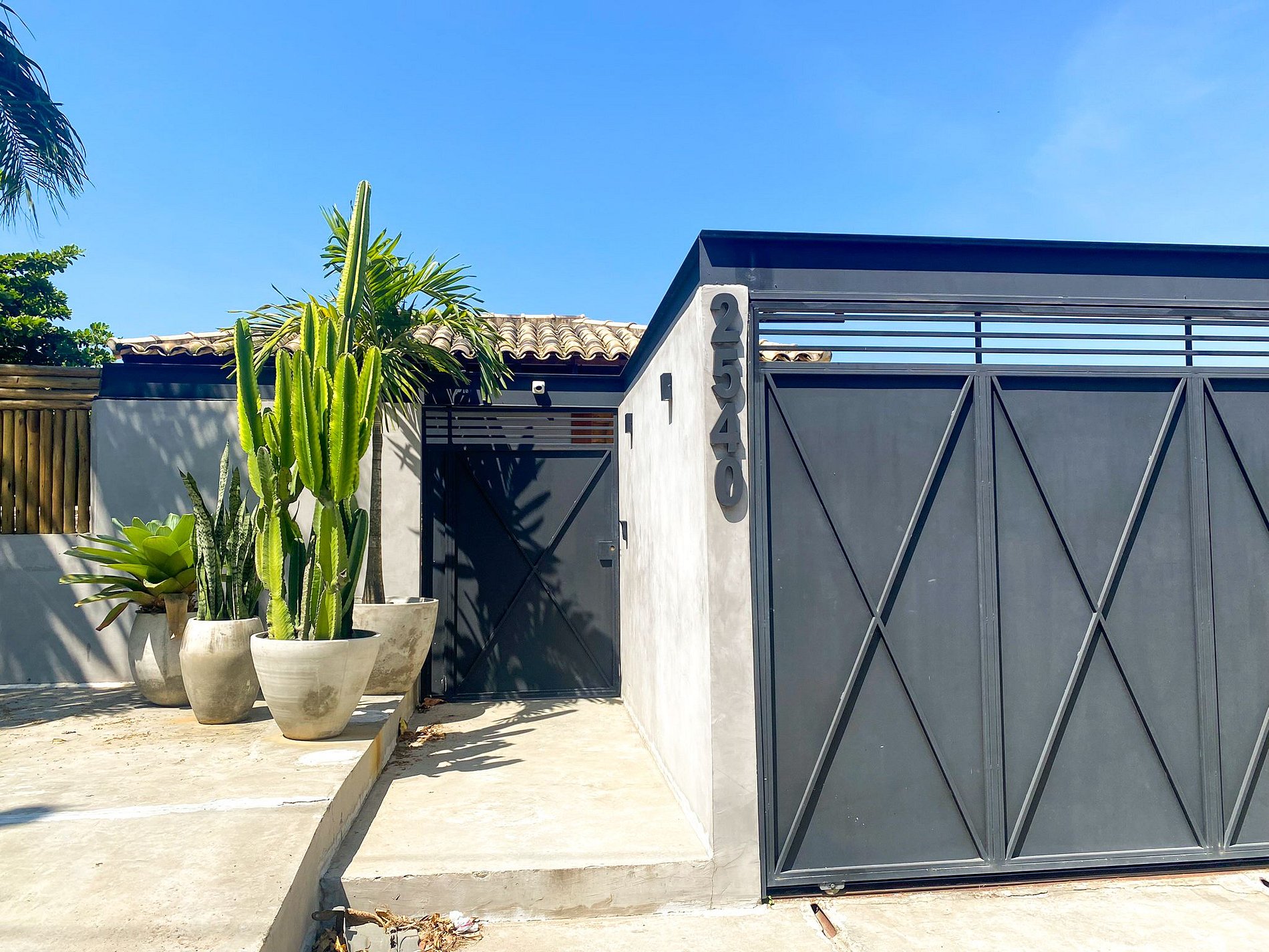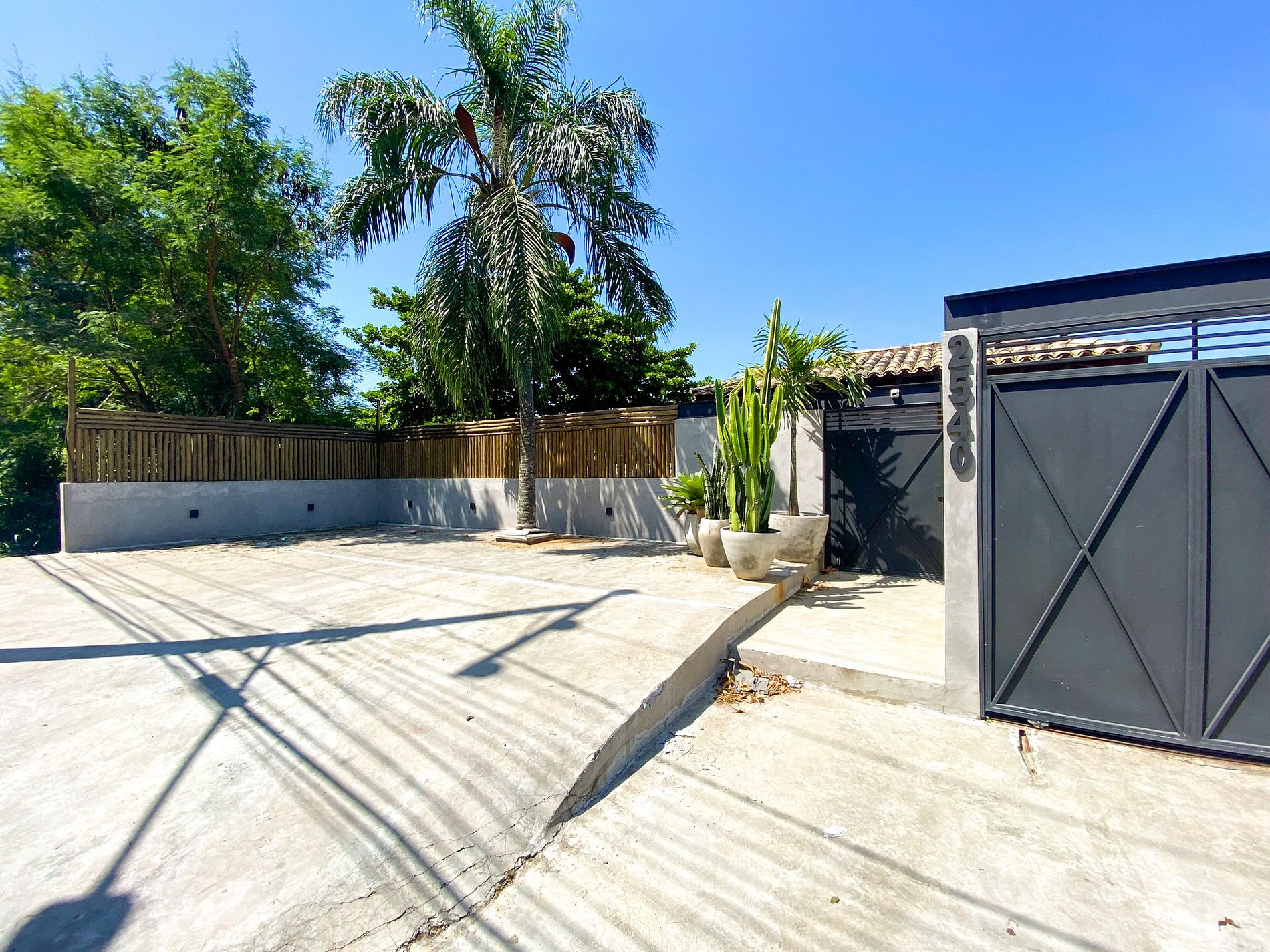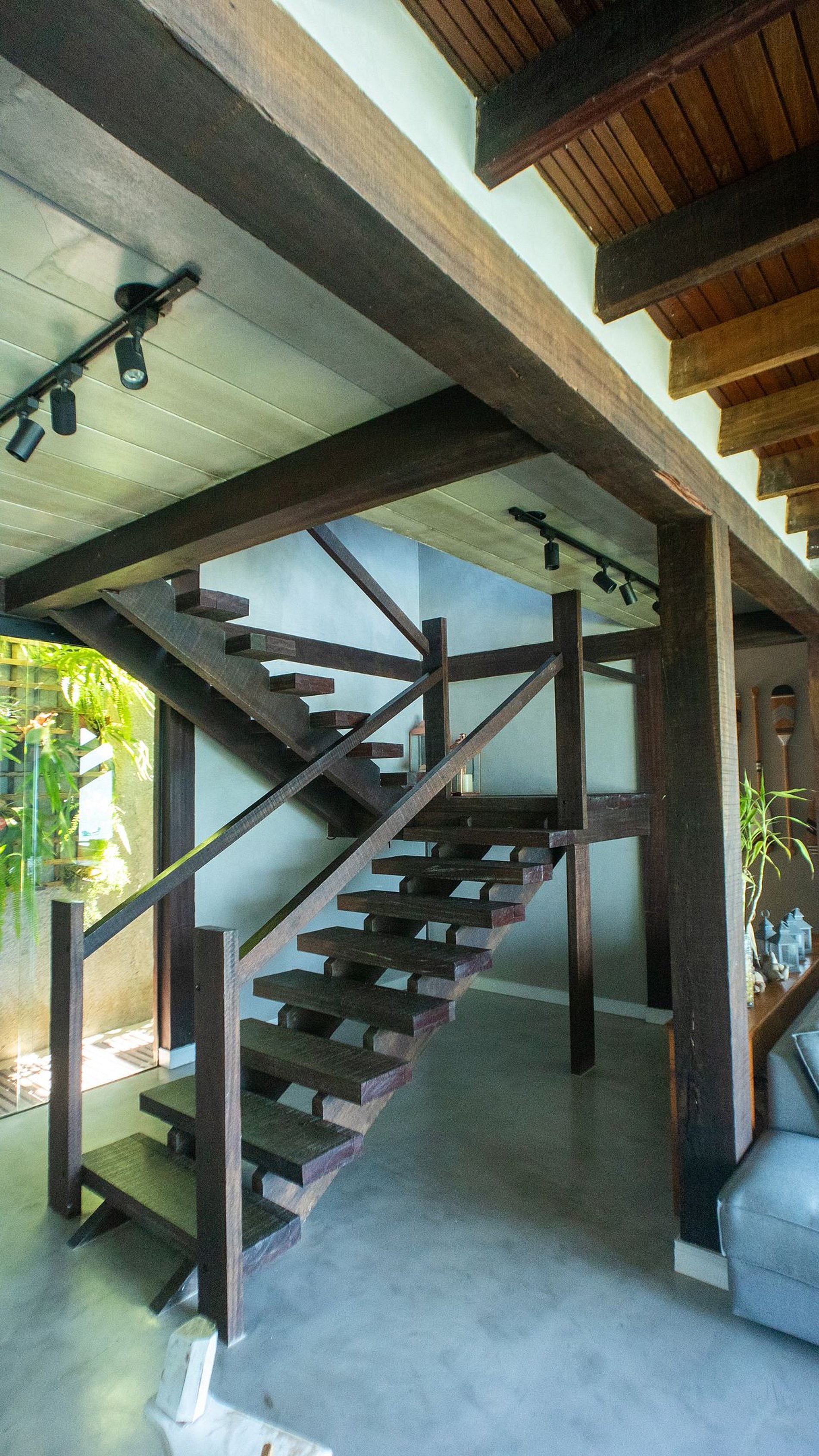 O acesso à casa é feito por escadas, com dois lances de aproximadamente 10 degraus cada, largos e com corrimão.